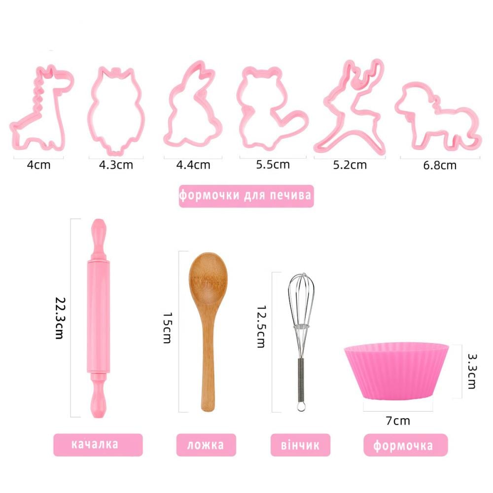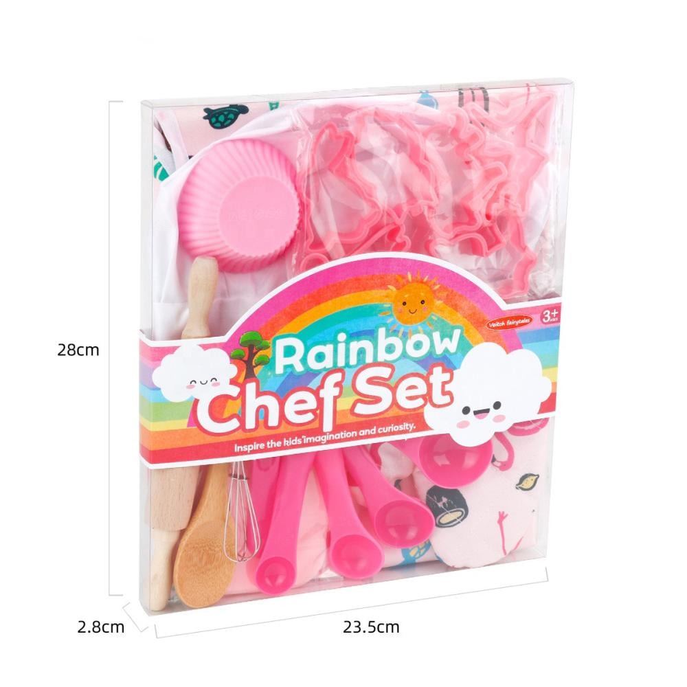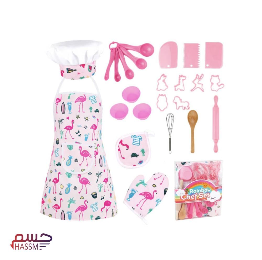 المئزر، وقبعة الشيف، وقفاز الفرن، ودبوس المتداول، وخفاقة، وملعقة خشبية، وقواطع ، وكتاب طبخ للأطفال.
