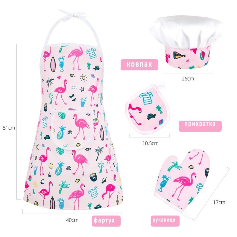 مصممة للأطفال الصغار: قبعة الشيف مرنة، وتحتوي المئزر على أحزمة لربطها حول الرقبة والخصر لتناسب معظم الأطفال الذين تتراوح أعمارهم بين 3-7 سنوات مع مساحة للنمو، والملعقة ودبوس المتداول مصنوعة من الخشب، وقفازات الفرن مملوءة بقطن PP .