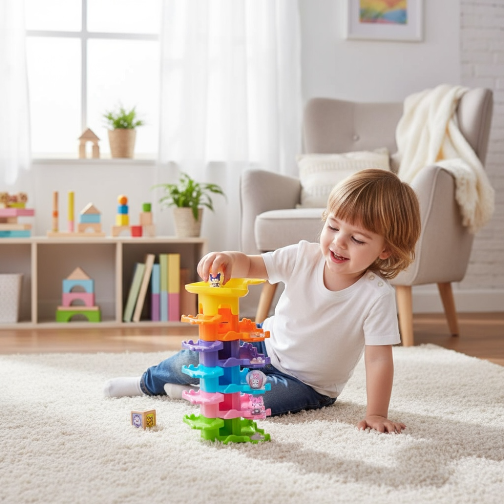يقوم الطفل بتركيب الطبقات الملونة فوق بعضها البعض لتشكيل برج المسار،