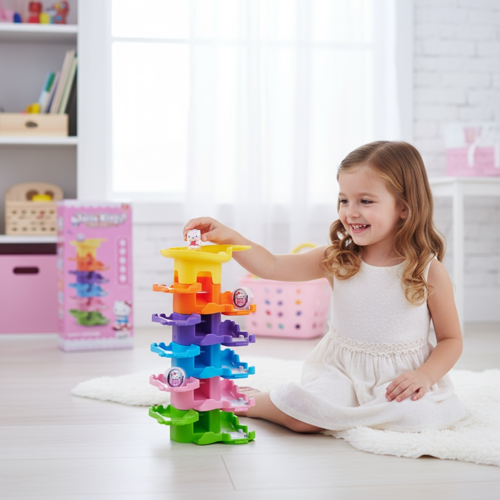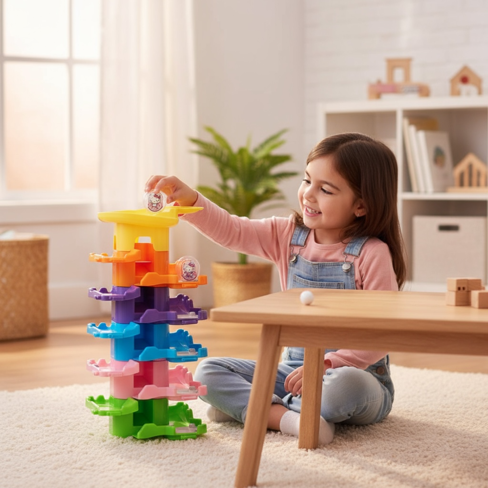يقوم الطفل بتركيب الطبقات الملونة فوق بعضها البعض لتشكيل برج المسار،