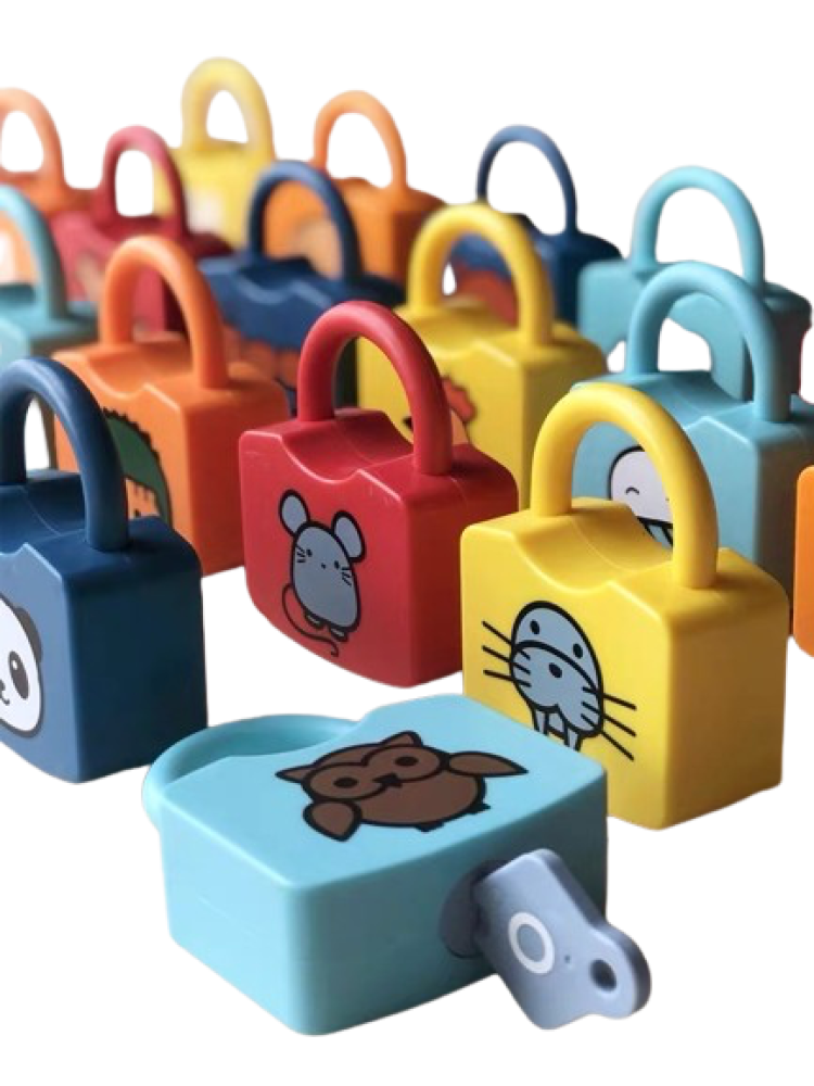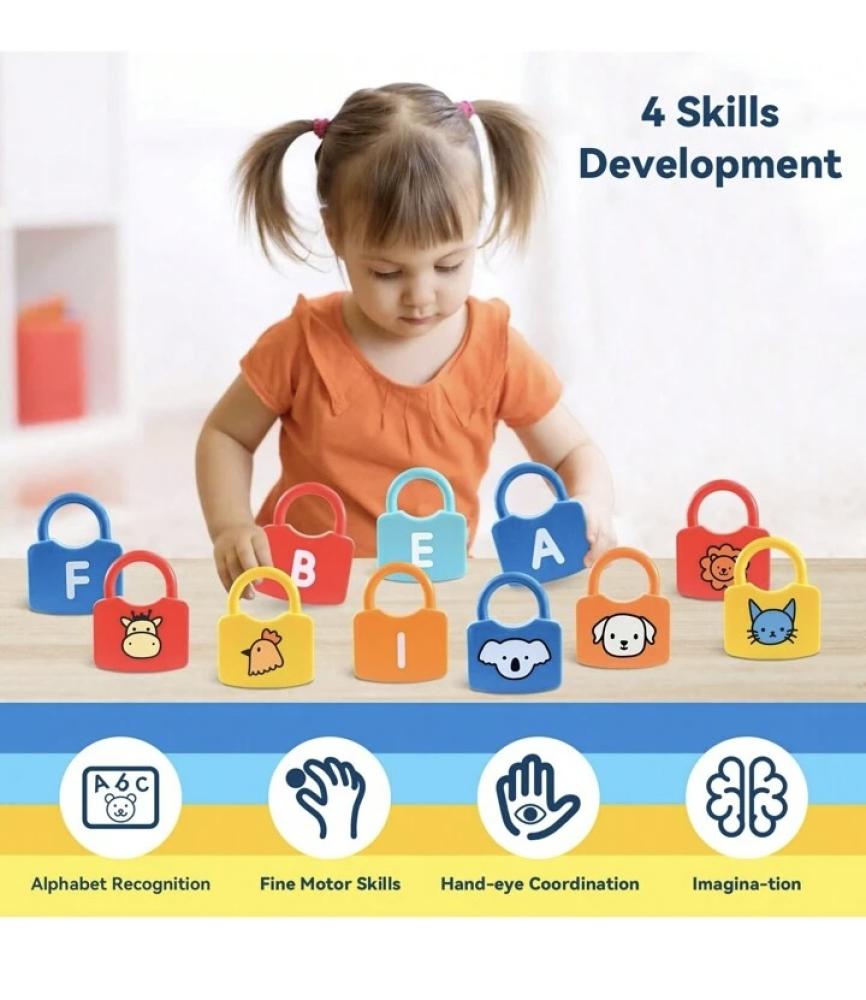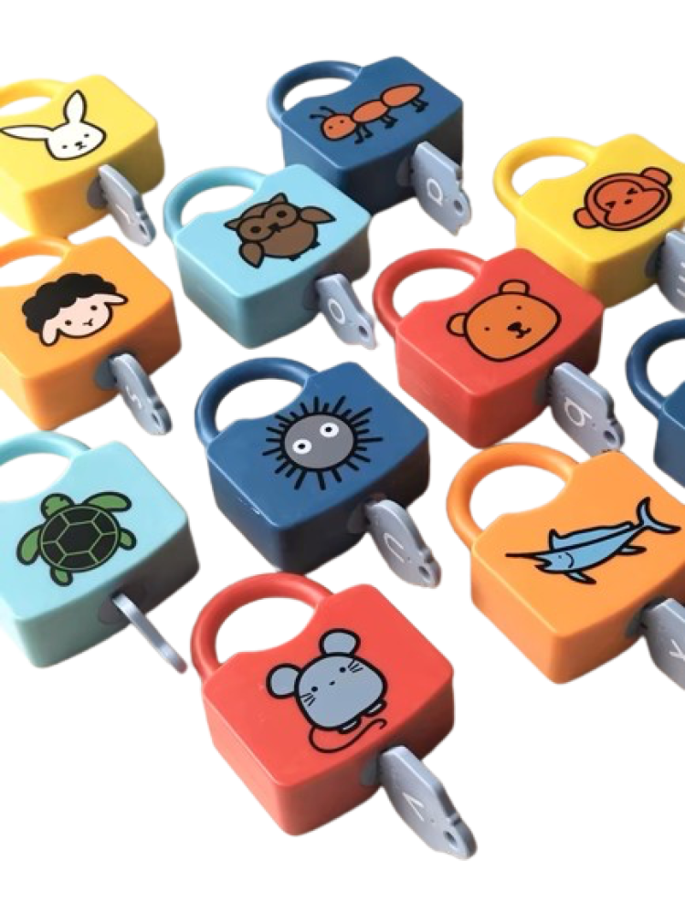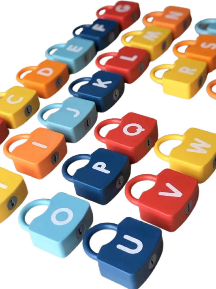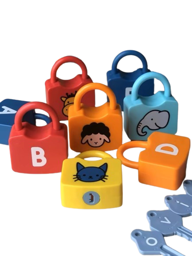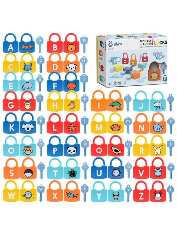 مجموعة من الحروف الأنجليزية تحتوي على 26 حرفًا كبيرًا وصغيرًا، والأقفال والمفاتيح تتوافق مع واحد إلى واحد، وعلى الجانب الخلفي، يوجد 26 حيوانًا متطابقًا بنفس الأحرف الأولى في أسمائهم الإنجليزية.